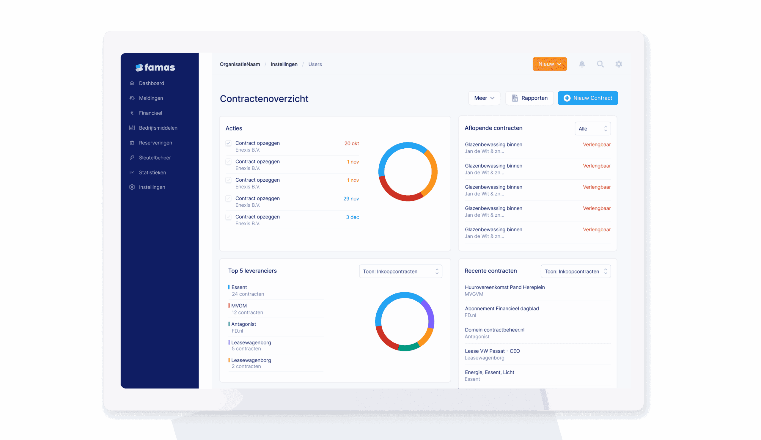 Famas FMIS is complete en overzichtelijke facility management software, speciaal ontwikkeld voor non-profit organisaties, MKB+ en grootzakelijke ondernemingen. Met Famas heb je alle essentiële tools voor facility management en contractbeheer, zonder overbodige modules of extra kosten. Met Famas FMIS krijg je niet alleen overzicht, maar ook eenvoudig te gebruiken tools om tijd te besparen, kosten te verlagen en kwaliteit te verhogen.