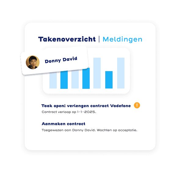 Beheer al je contracten overzichtelijk vanuit één centraal systeem. Behoud overzicht en sla alle relevante contactinformatie op. Ook vergeet je nooit meer een afloopdatum door middel van automatische alerts.
